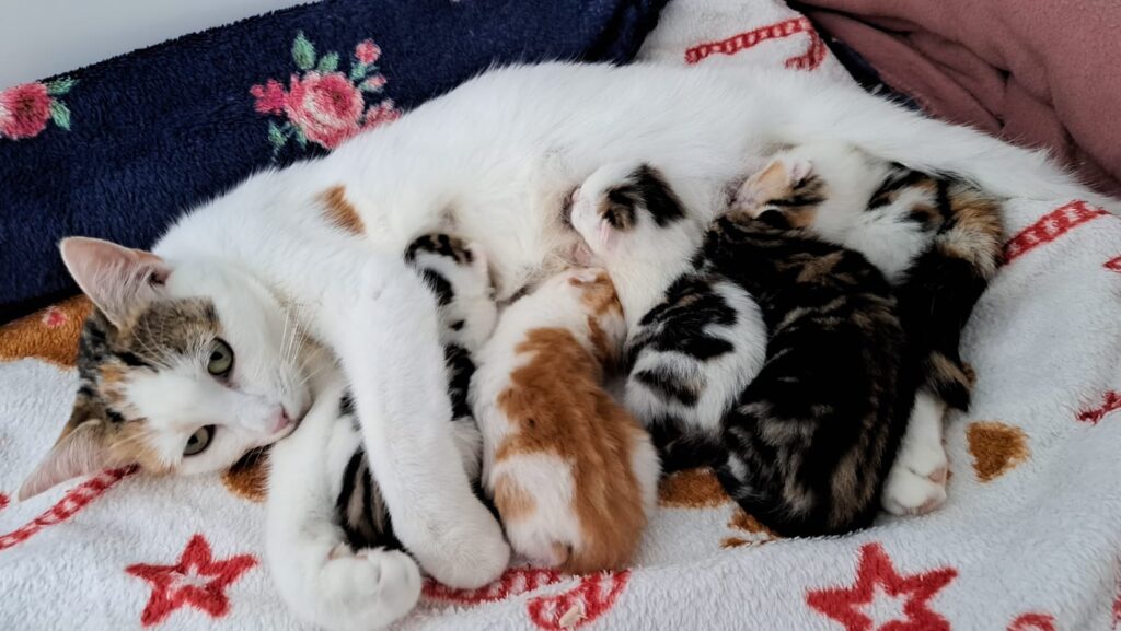 It all started with our beautiful Tango, who came in with an existing litter of 5 lovely kittens. During a routine vet check, we were surprised to discover that Tango had already become pregnant again prior to her arrival at Heaton’s Cats which was soon after her previous birth. We moved her to her own pen and prepared for her labour which happened soon after. We were so relieved when she successfully gave birth to 7 more brand new kittens which she immediately started to look after like the brilliant Mum that she is.