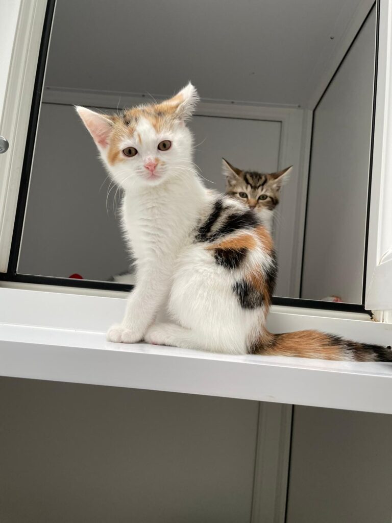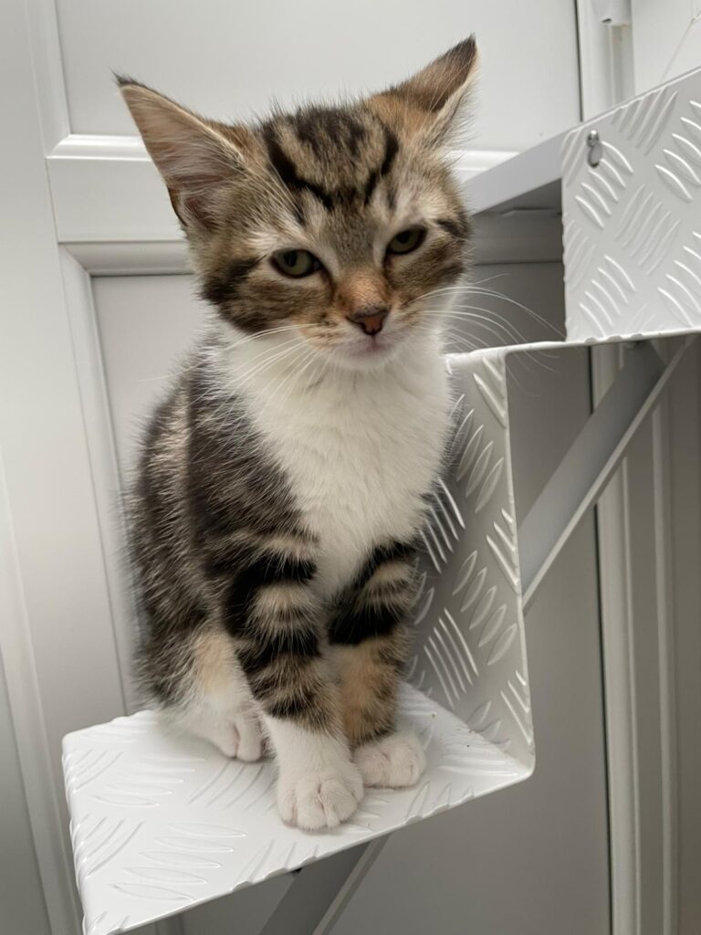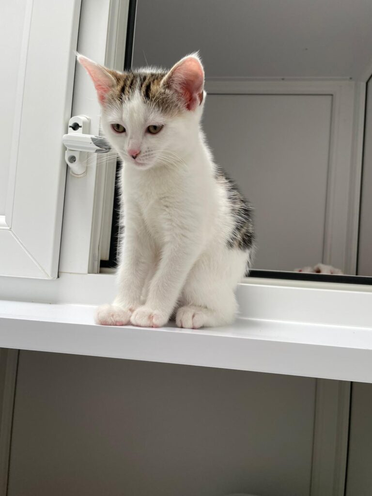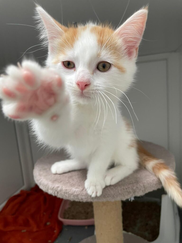 “The Snack” kittens, Pretzel, Pringle, Skip and Peanut were born at the sanctuary and are ready to be rehomed. Peanut is the only boy of the crew and is ginger and white, he has always been the most confident and cheeky, loves a cuddle and will happily try and get on your shoulder to view the world from a different angle. Skip is a cute white and tabby girl who likes to join in on any mischief that’s occuring. Pringle, another girl, is our little calico looking the most like her mum. Pringle loves to play with her siblings and enjoys a fuss and head rub. Pretzel is the third girl in the litter, she is tabby and white and probably the most cautious of the crew at the moment but all these kittens will flourish in a new home.
